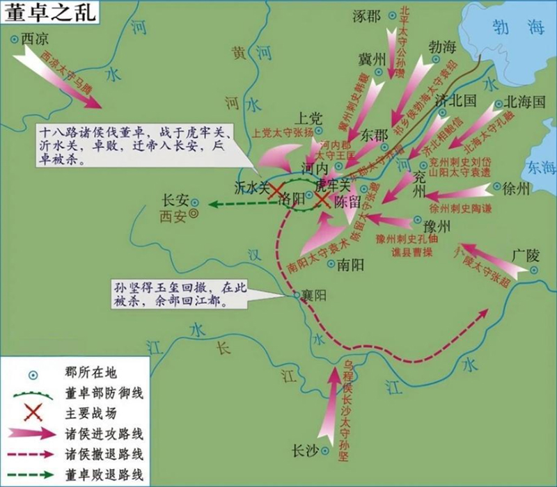 初平元年(190年),函谷关以东的各州、郡全都起兵讨伐董卓,推举勃海太守袁绍为盟主。袁绍自称车骑将军,诸将全都被临时授予官号。袁绍与河内郡太守王匡驻军河内,冀州牧韩馥留守邺城,供应军粮。豫州刺史孔伷驻军颖川,兖州刺史刘岱、陈留郡太守张邈、张邈的弟弟广陵郡太守张超、东郡太守桥瑁、山阳郡太守袁遗、济北国相鲍信和曹操都驻军酸枣,后将军袁术驻军鲁阳。各路军马都有数万人,组成关东联军。