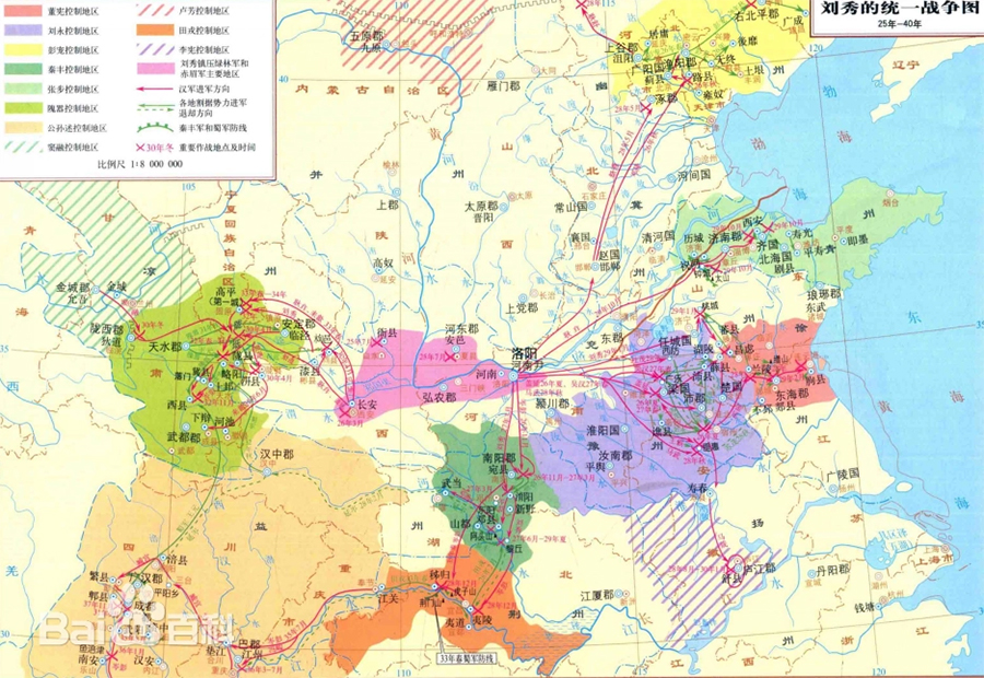 刘秀称帝后,虽然控制有了洛阳以北的地区(今河南省北部、河北省大部和山西省大部),但是仍处于各种武装势力的包围之中。东有青州的张步,东海的董宪,睢阳的刘永,沪江的李宪;南有南阳的秦丰,夷陵的田戎;西有成都的公孙述,天水的隗嚣,河西的窦融,九原的卢芳;北面的彭宠也在后来被朱浮逼反。此外,尚有赤眉等农民军活动于河水(黄河)南北。