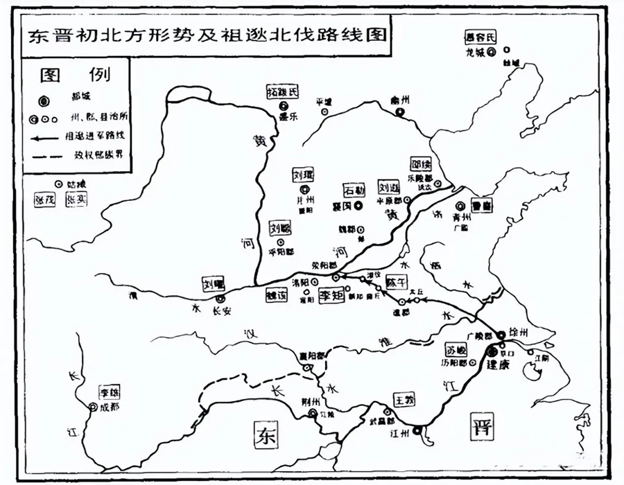 祖逖,字士稚,范阳遒县(今河北涞水县)人。士族出身,任西晋司州主簿。值大乱前夕,怀抱报国之志,对每况愈下的政局十分关切。半夜里听见鸡鸣,即起身至户外,拔剑起舞,留下了“闻鸡起舞”的佳话。西晋末年洛阳沦没后,祖逖率领亲族乡党数百家避乱南下,“以所乘车马载同行老疾,躬自徒步,药物衣粮与众共之,又多权略,是以少长咸宗之,推逖为行主。”时司马睿与南北门阀士族正热衷于建立东晋新朝廷,进行权力再分配,根本无意于北伐。祖逖不甘故国倾覆,恒存振复之心,主动请缨,要求领兵北伐。司马睿任命他为奋威将军、豫州刺史,但除了千人粮饷和3千匹布外,未给一兵一卒和兵器铠甲。