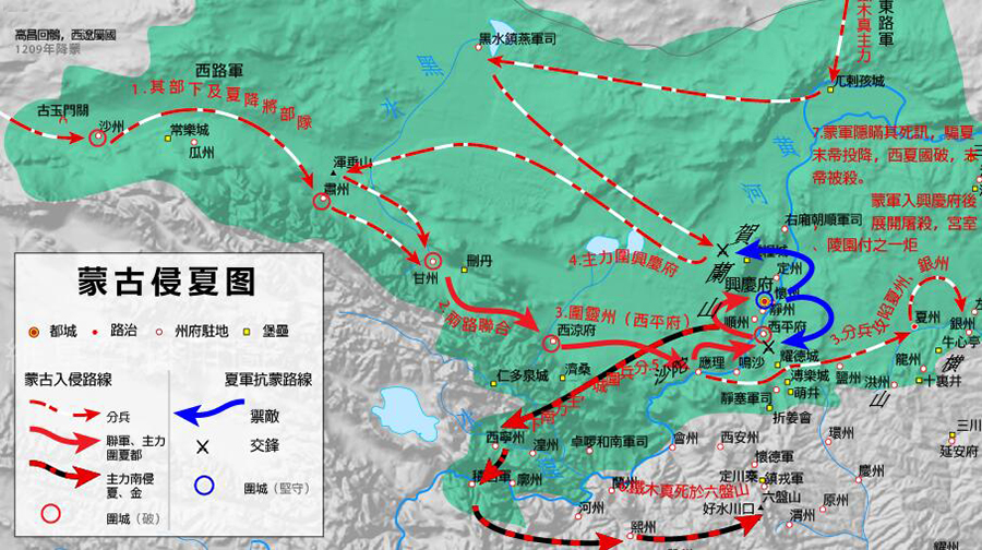 1226年8月,蒙古大军实行“黄河九渡”,成功占领应理、夏州等地,并决定围攻灵州。西夏将领嵬名令公带领援军协助抗敌,但最后仍然失败抵抗蒙古的入侵,更加战败身亡。而后,蒙古大军十分顺利地攻占积石州、西宁等地。直到此时,蒙古大军只差西夏最后领土——都城中兴府仍未失陷。