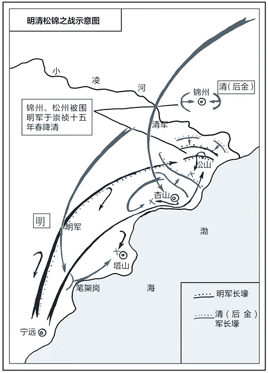 明崇祯十三年(清崇德五年,1640年)三月,清太宗皇太极吸取过去强攻宁远、锦州受挫的教训,制定了长围久困、迫其出降的作战计划,命郑亲王济尔哈朗、多罗贝勒多铎等人领兵修筑义州城(锦州义县义州镇)。义州处于广宁与锦州之间的大凌河畔,地势开阔、土地肥沃,在此筑城屯田,实际上是建立了攻锦的前哨阵地,同时一旦攻锦,此地又是一个绝佳的后勤补给基地。同年六月,皇太极指挥清兵兵临锦州,开始了围城的持久战。皇太极将围城清兵分为两班以个月为一期轮番更换。同时清兵将锦州城外的庄稼收割完毕,并扫荡清除明军在锦州外围的据点,彻底切断驻锦明军与外部的联系。翌年三月,皇太极进一步采取措施,在锦州城外筑起座营垒,环城相列,在营垒外深挖壕沟,树起栅木,而各营间又有深壕相连,将锦州围得“水泄不通”。明军守城主将为昔日袁崇焕帐下大将、征辽先锋大将军祖大寿,其所率军队中有相当一部分是蒙古人,城既被围,遂起叛心,秘密与济尔哈朗联系。此事为祖大寿侦知,欲计擒叛军首领,无奈行事不密,反被叛军窥破,抢先与明军交战,济尔哈朗闻讯后,趁势攻城,内外夹攻,祖大寿难以支持,只能退入内城坚守。