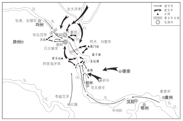 襄阳、樊城地处南阳盆地南端,依岘首山(今襄阳南)而峙,夹汉水而立,跨连荆豫,控扼南北,地理位置十分重要。且城坚池深,仓储丰厚,是南宋军事重镇。蒙古军针对襄、樊设防情况,知道强攻很难取胜,于是采取四面筑堡、长期围困、水陆阻援、待机破城的战法。遂筑堡于鹿门山(今襄阳东南)、白河口(今襄阳东北),切断宋军南北联系,对襄、樊形成包围。时南宋权相贾似道把持朝政,昏庸腐败,怯战乞和,曾与忽必烈订有割地称臣的密约,故不派得力将领率兵增援。因此宋军虽有几路援兵,守将吕文焕也多次出击,终未能改变被困局面。