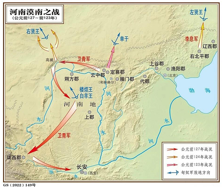 元朔六年春,武帝命大将军卫青率中将军公孙敖,左将军公孙贺,前将军赵信,右将军苏建,后将军李广,强弩将军李沮等六将军共10余万骑出定襄击匈奴,斩首数千而还,休整于定襄、云中、雁门。(定襄北之战)