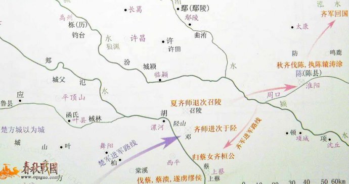 - 会和盟不同,齐国率领的诸侯联军的会有三次,第一次侵蔡伐楚并没有说地址,第二次则是陉地,第三次才是召陵,盟则只在召陵。